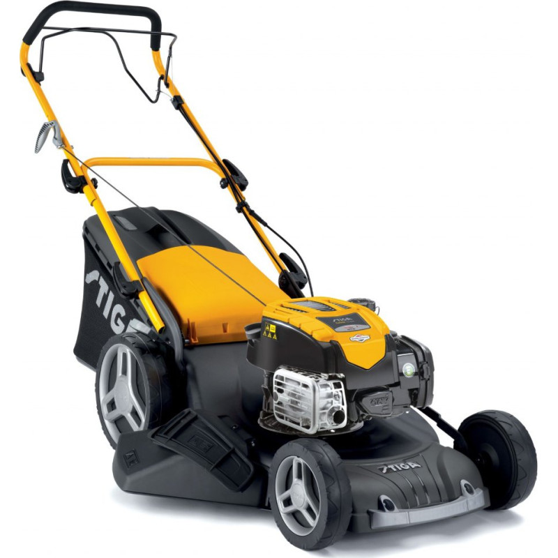 Sekačka s pojezdem a benzínovým motorem o objemu 166 cm3 a systémem sečení 4 v 1: sběr, mulčování, boční výhoz a zadní výhoz. Sběrací koš o objemu 60 litrů.